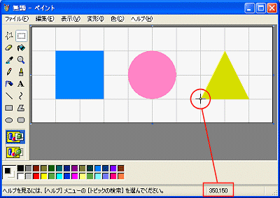 - ペイントの場合: 調べたい位置にカーソルを合わせると、右下(または左下)に座標が表示されます。