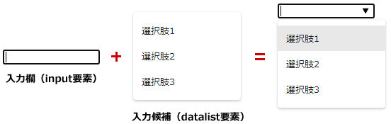 datalist要素は、入力欄(input要素)に対する入力候補のリストを表します。入力候補の選択肢は、この要素内に配置するoption要素で示すことになります。