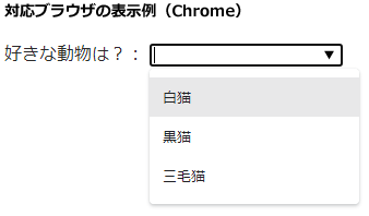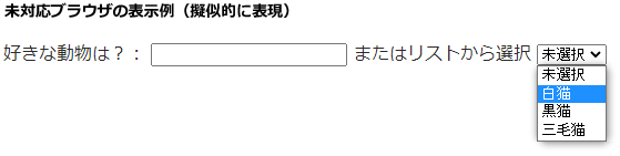 未対応のブラウザでは、datalist要素内のフレージング・コンテンツ(テキストとselect要素)が表示されることになります。