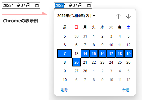この部品タイプに対応しているブラウザでは、カレンダーを使って週を入力することができます。